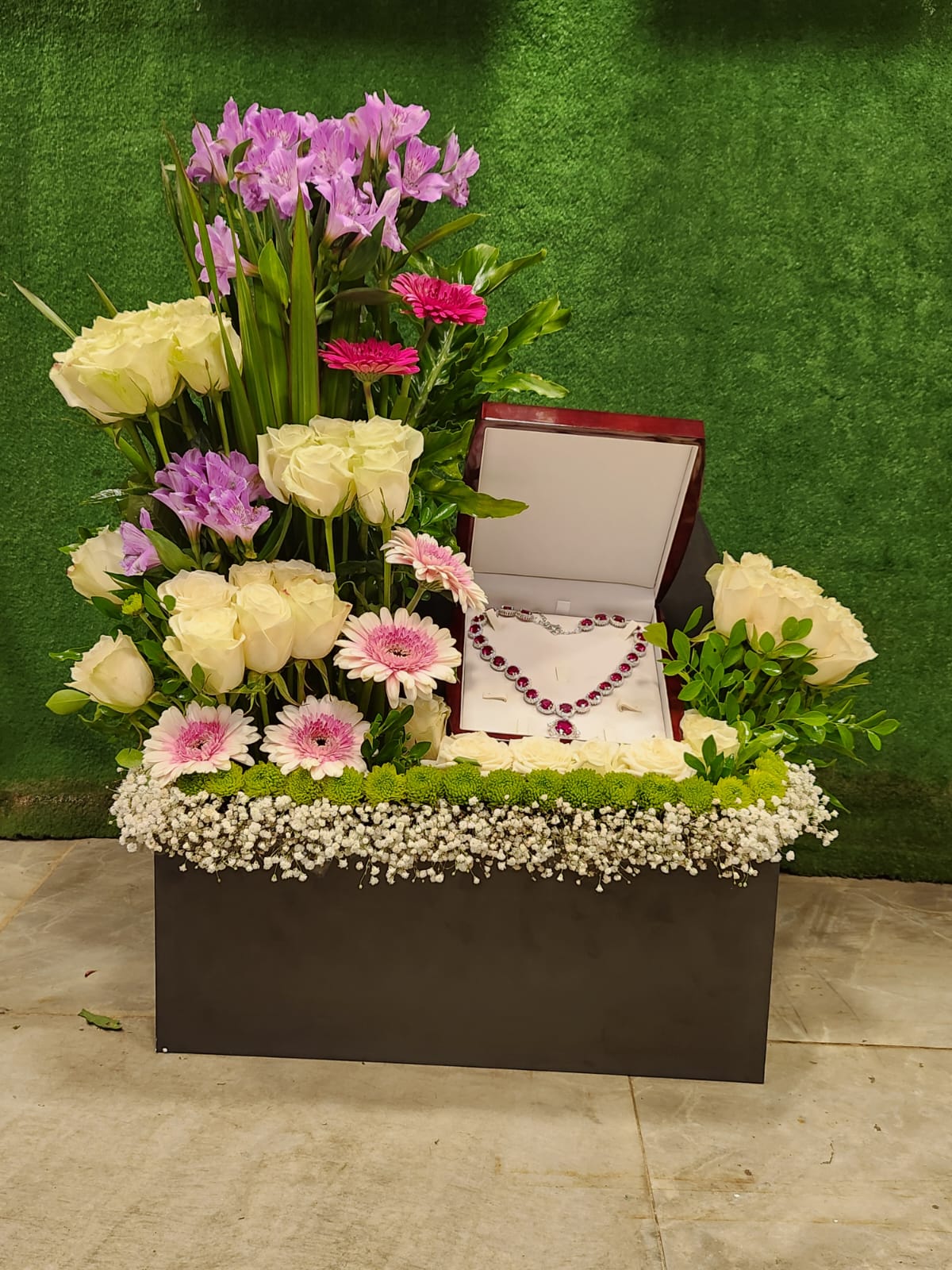 The most romantic gift imaginable — flowers AND fine jewellery, united in one unforgettable moment. A stunning floral arrangement surrounds an open jewellery box displaying a magnificent ruby and diamond necklace set, creating a presentation so breathtaking it deserves its own spotlight.