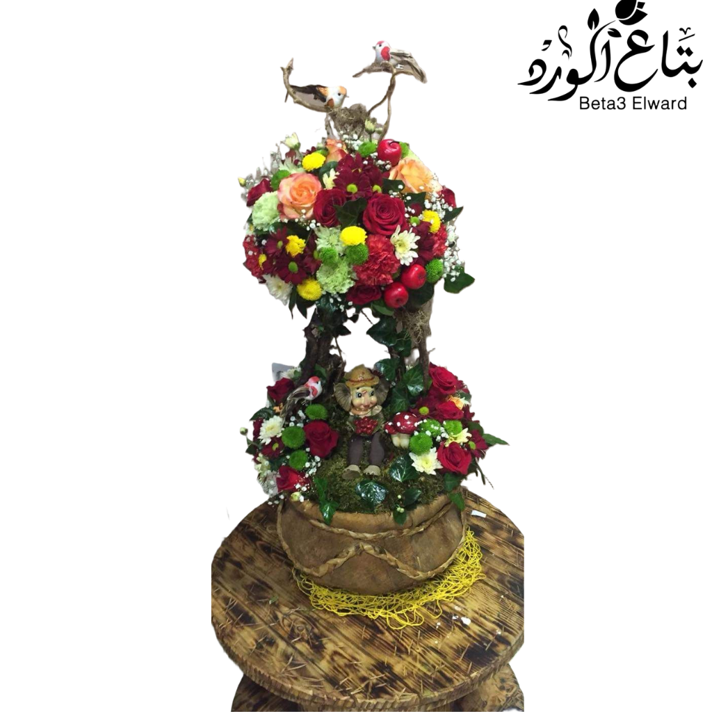 Red & peach roses — blooming across every branch with timeless romance Yellow & green chrysanthemums — bursting with color and whimsy Baby’s breath — floating like tiny clouds throughout Decorative red apples — nestled among the blooms like hidden treasures Two love birds perched on top — a symbol of togetherness and love A charming gnome figurine — peeking out from the enchanted base Tiny mushrooms & green moss — bringing the forest floor to life Lush ivy & woodland greens — cascading naturally around the base