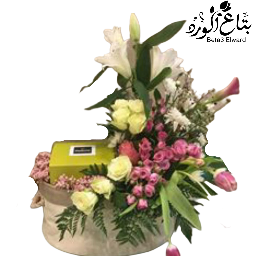 Tall white oriental lilies — majestic, fragrant, and impossibly elegant  Soft cream roses — gentle, pure, and timeless  Pink spray roses — delicate, sweet, and abundantly full  Pink tulips — fresh, graceful, and utterly charming  Pink calla lilies — exotic and sophisticated  Feathery ferns & wild greens — giving a natural, effortless feel  A premium chocolate box — the perfect sweet surprise nestled within