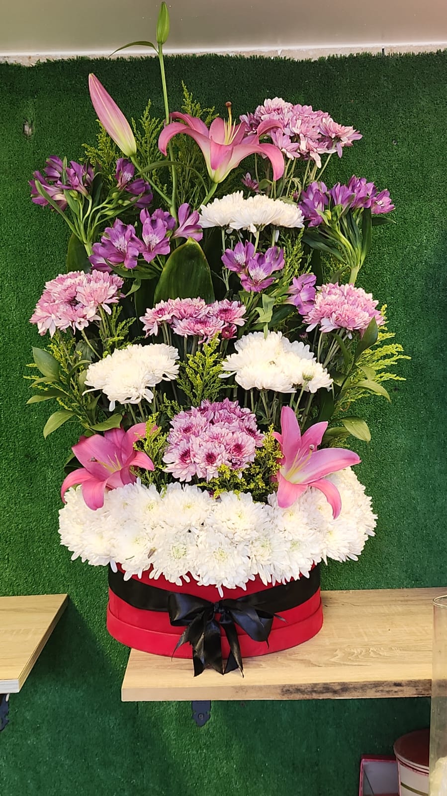 A beautifully layered, towering floral arrangement that builds upward with grace and intention — from a pristine white base all the way to soaring pink lilies at the crown. Every layer tells a different story, every bloom adds a new whisper of beauty.