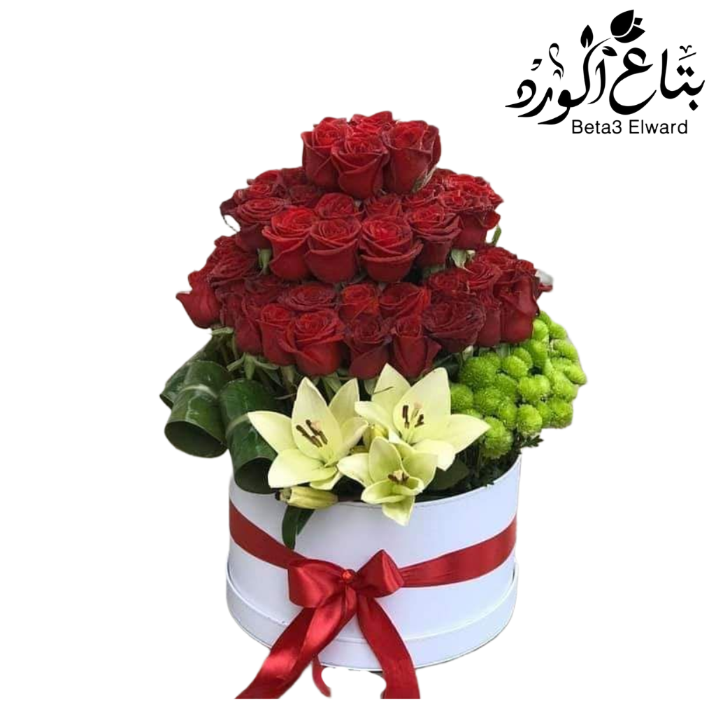 Premium deep red roses — stacked high in a lush, dome-shaped tower of pure romance Rolled tropical leaves — adding a sleek, modern architectural touch Soft cream lilies — delicate and fragrant, blooming at the front Green button chrysanthemums — fresh, playful, and perfectly complementing the reds