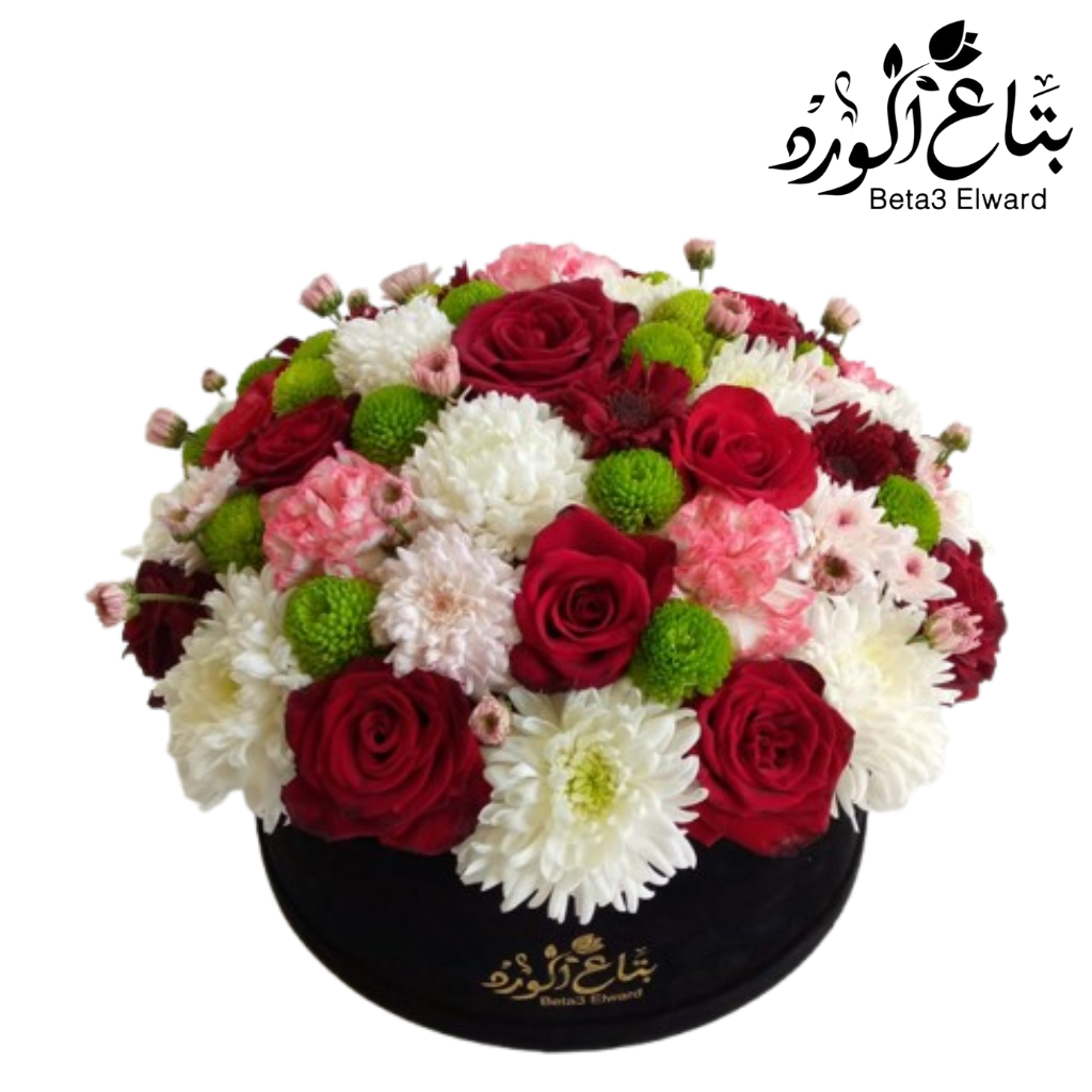 A celebration of color and life! This exquisite arrangement features a playful mix of vibrant red roses, pure white chrysanthemums, soft pink carnations, and refreshing green accents. Set in our signature black velvet hatbox, this “garden in a box” brings a burst of joy and energy to any space.