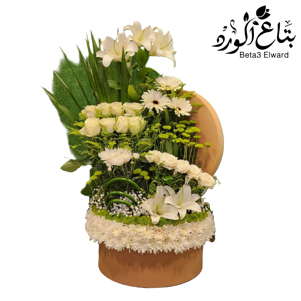 There is a rare kind of beauty in simplicity — and this arrangement captures it completely. An all-white floral masterpiece, layered and tiered with extraordinary depth, presented in a warm golden-beige open box that frames every bloom like a living painting.
